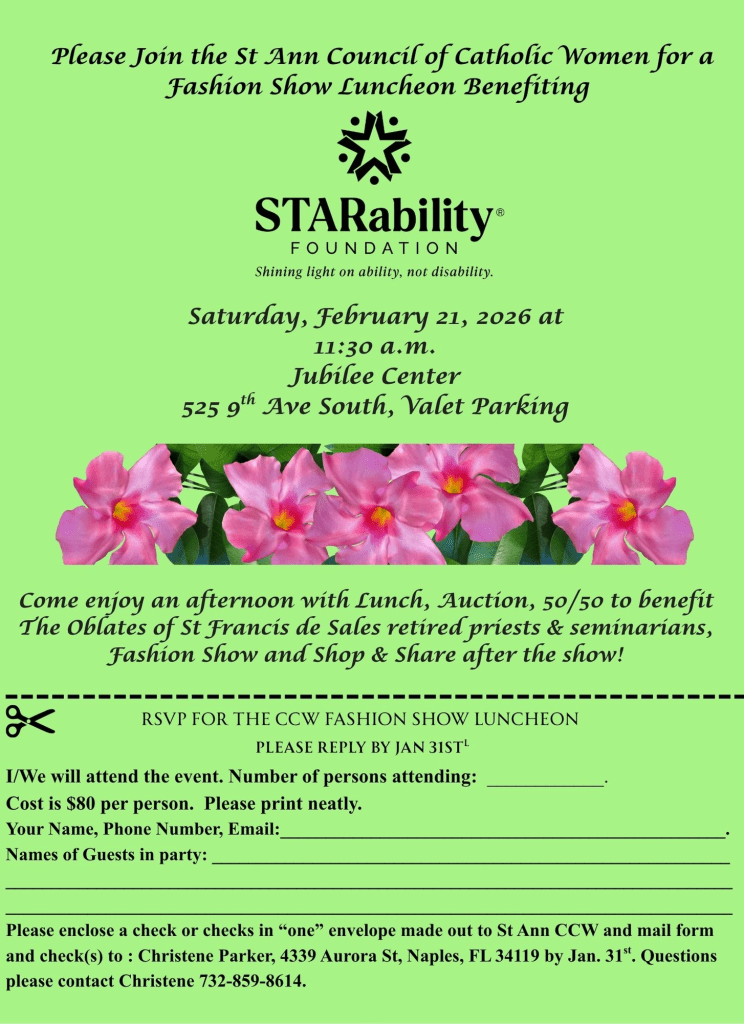 Please join the Saint Ann Council of Catholic Women (CCW) for a Ladies Fashion Show Luncheon